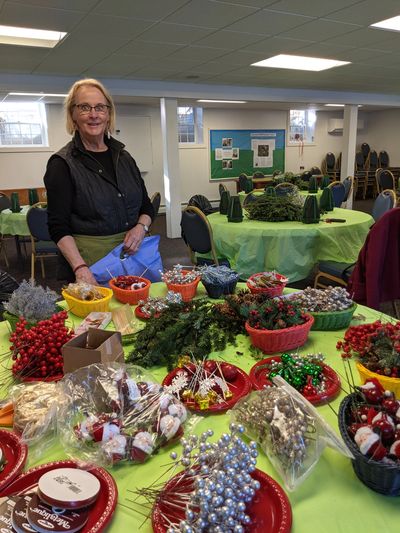 Once again, Sarah Hall directed us in creating boxwood holiday centerpieces. at the December 12 meeting.