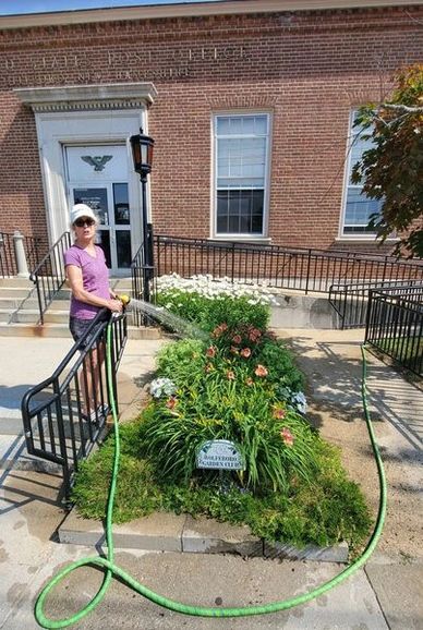 Carol Bly keeping up the Post Office Garden.