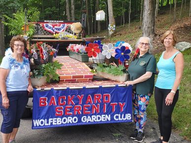 "Back Yard Serenity" was the theme for this year's parade float. Pictured are Nancy Saltmarsh, Bobbie Stave, and Joyce Lake.